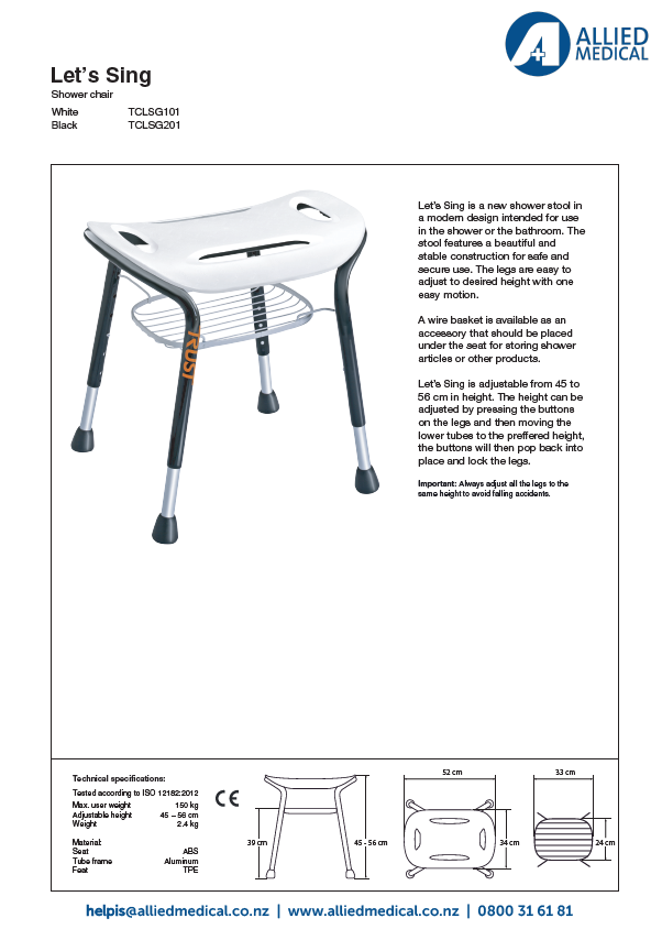 The Let’s Sing Shower Stool is a safe, modern seating solution for the bathroom. With supportive side handles and height adjustment, it’s available in Black or White.