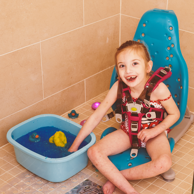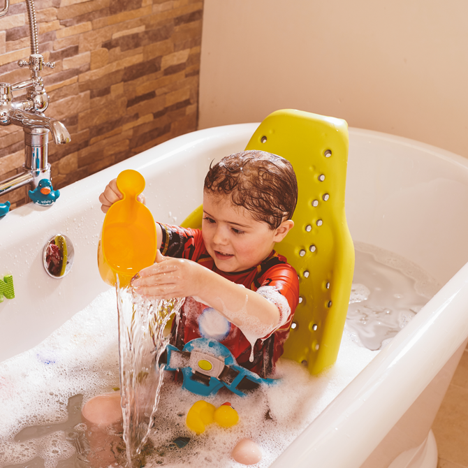 The Splashy is compact and sits low in the bath, so uses less space and less water, whilst being lightweight, with detachable parts, making it easy to clean. You can lift and store Splashy easily, so there’s no bulky equipment permanently hogging the tub anymore.
