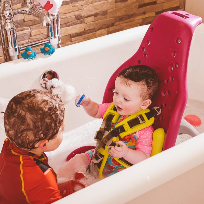 The Splashy is a lightweight, portable bath seat, designed to sit low in the bath to allow children to benefit from being immersed in the water. It is ideal for children aged 1-8 years old for bathing or getting involved with messy games both inside and outside.