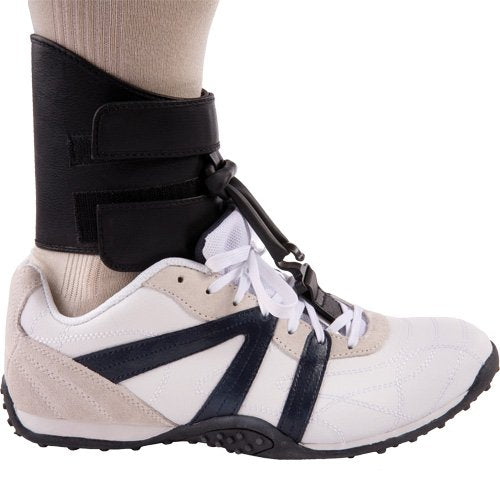 The Dictus Band is a different concept from other braces. Where the normal standard A.F.O. - which are non-flexible - holds the foot straight to stop the foot dropping, the Dictus Band uses a spring action with the rubber band and hook. This gives a more natural action and as a side benefit allows a person to do things that would be impossible with a polyethylene A.F.O. (i.e.: drive a car with their right foot).