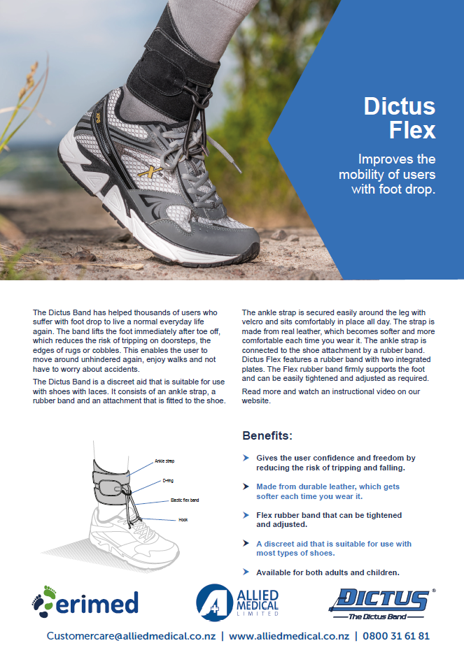The Dictus Flex features a 'Flex' rubber band that has two integrated Velcro pads that are secured onto a velcro loop lined ankle band. The rubber band firmly supports the foot and can be easily tightened and adjusted as required to provide a dynamic dorsiflexion moment.