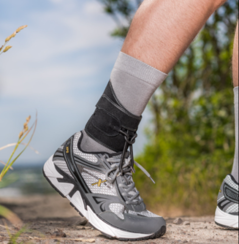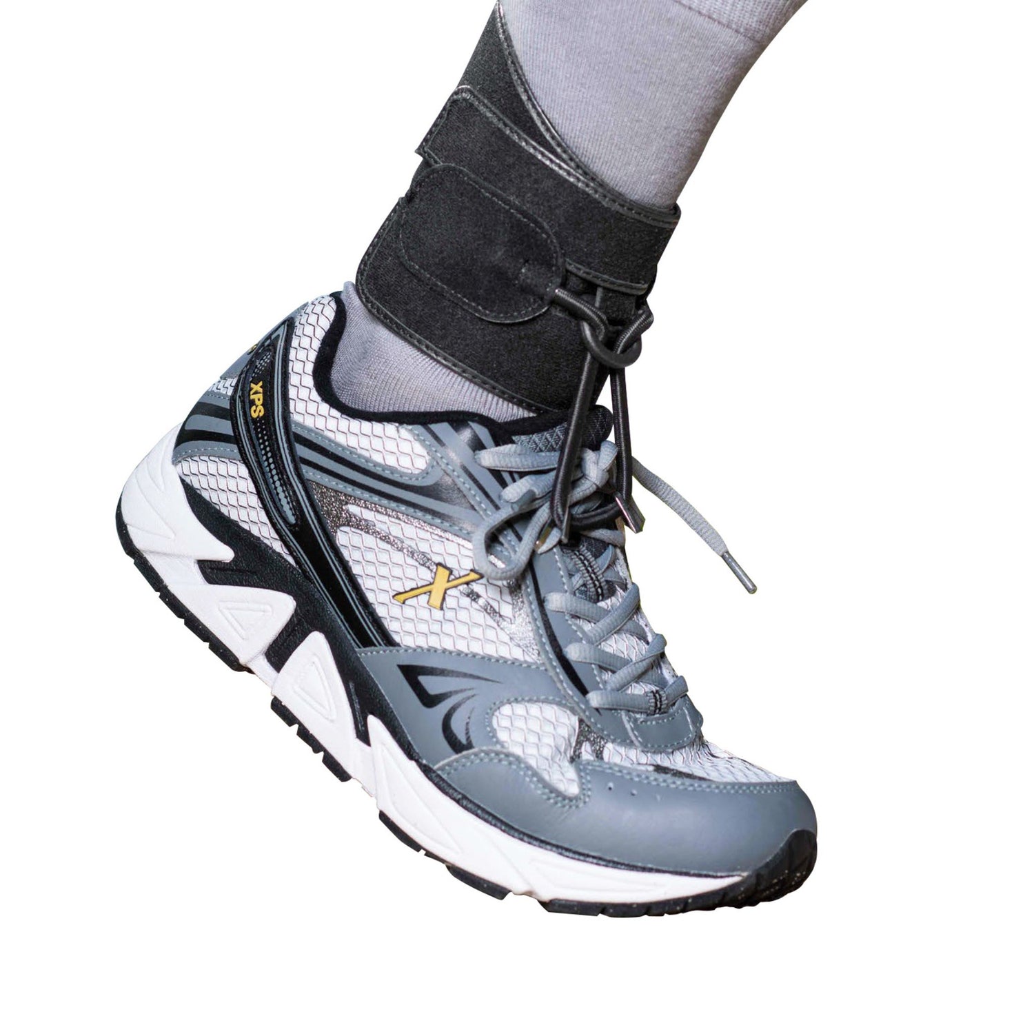 The Flex is an updated version of the Dictus Band that allows the user to adjust the amount of “spring” they have in the support. Rather than using the standard rubber band, it uses an elasticated strap with Velcro receptive pads at either end that can be attached to the ankle band at any location. The elasticated strap firmly supports the foot and can be easily tightened and adjusted as required to provide a dynamic dorsiflexion moment.