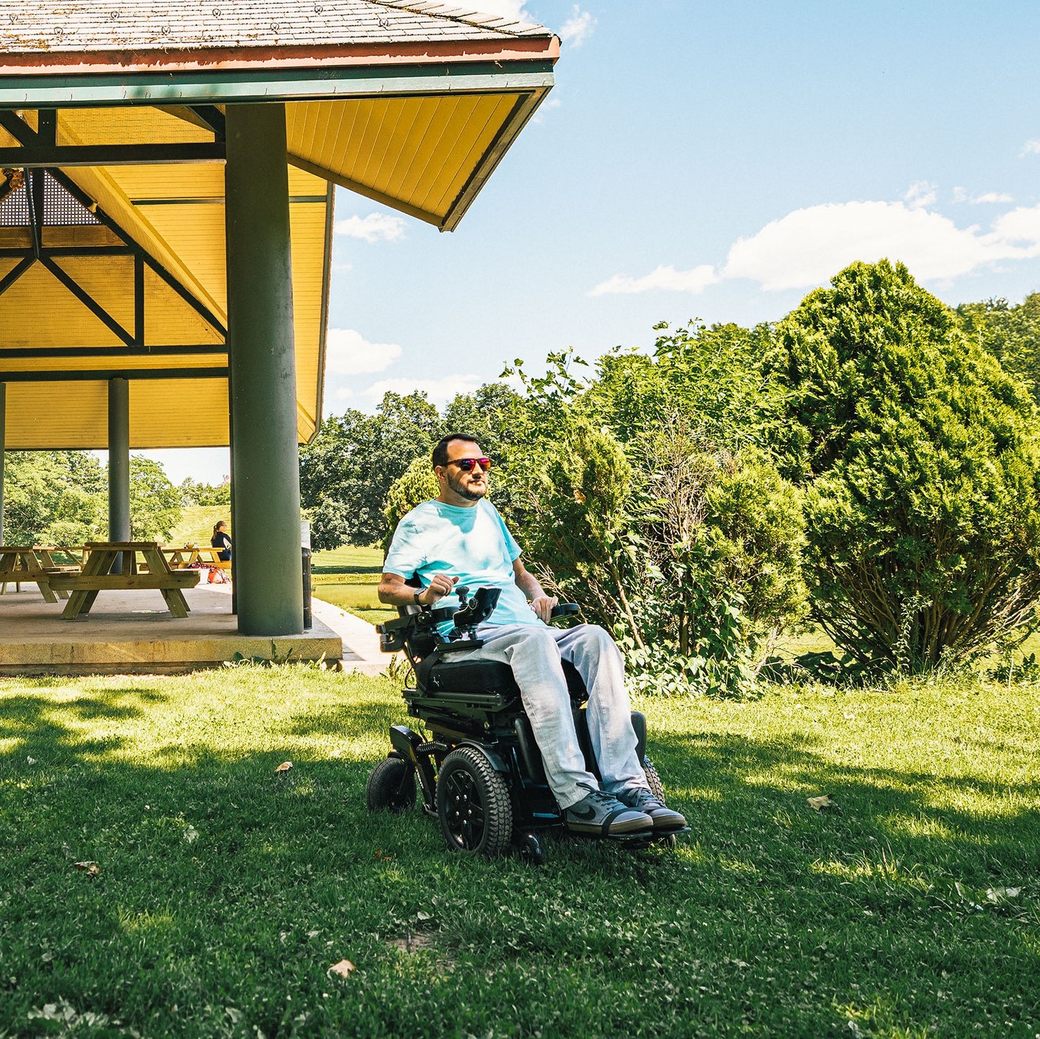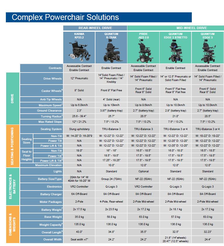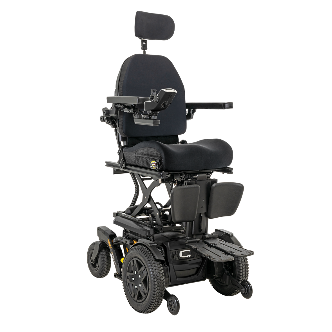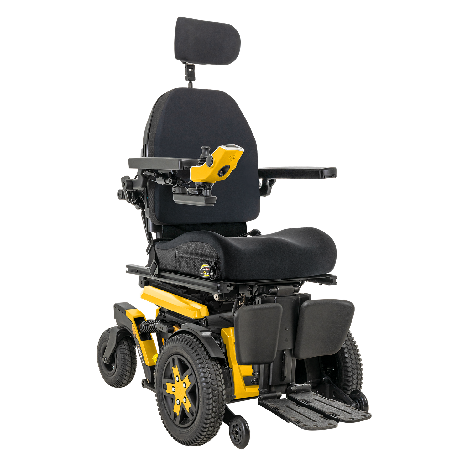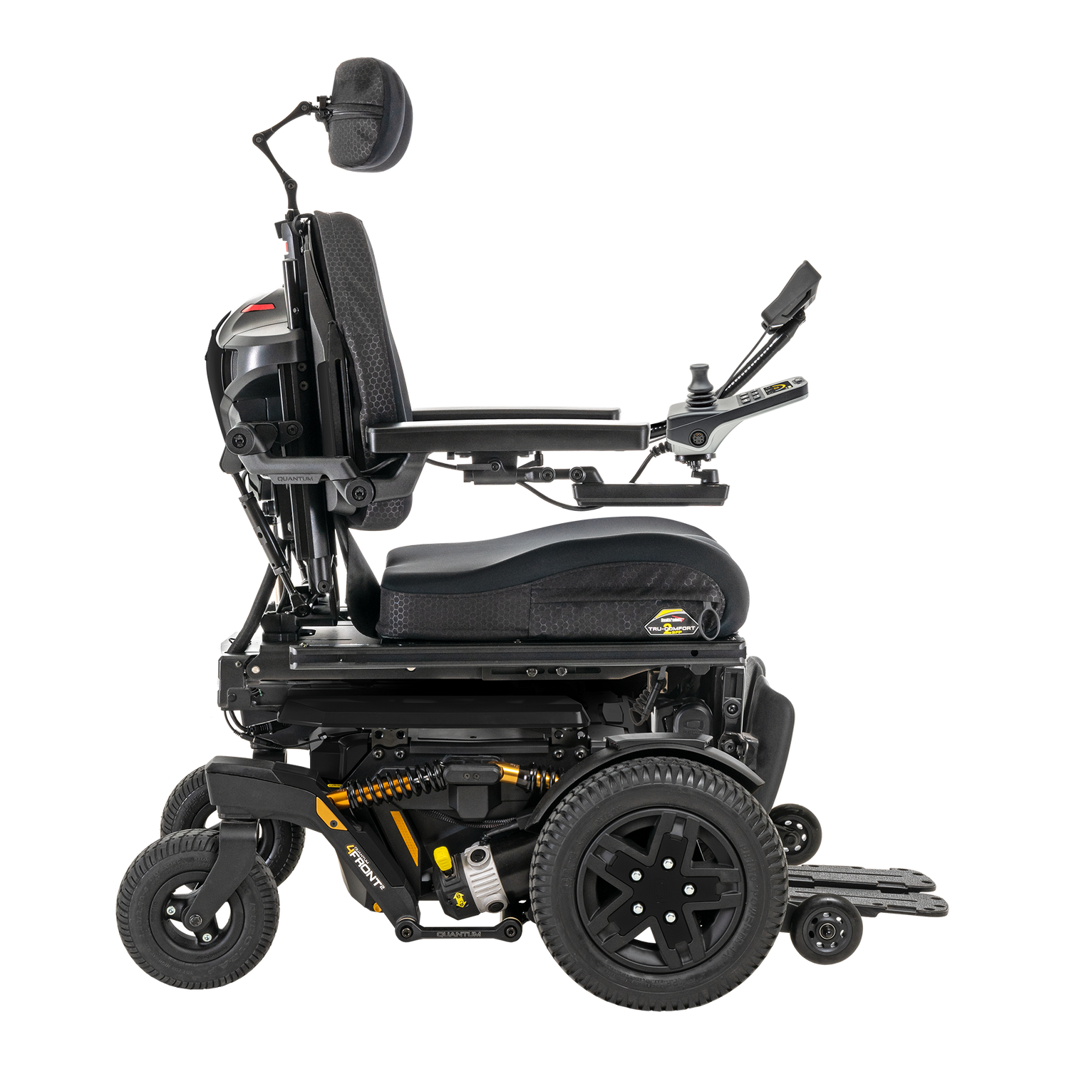 - Compact full-size front-wheel drive powerchair with 6 wheels on the ground for stability