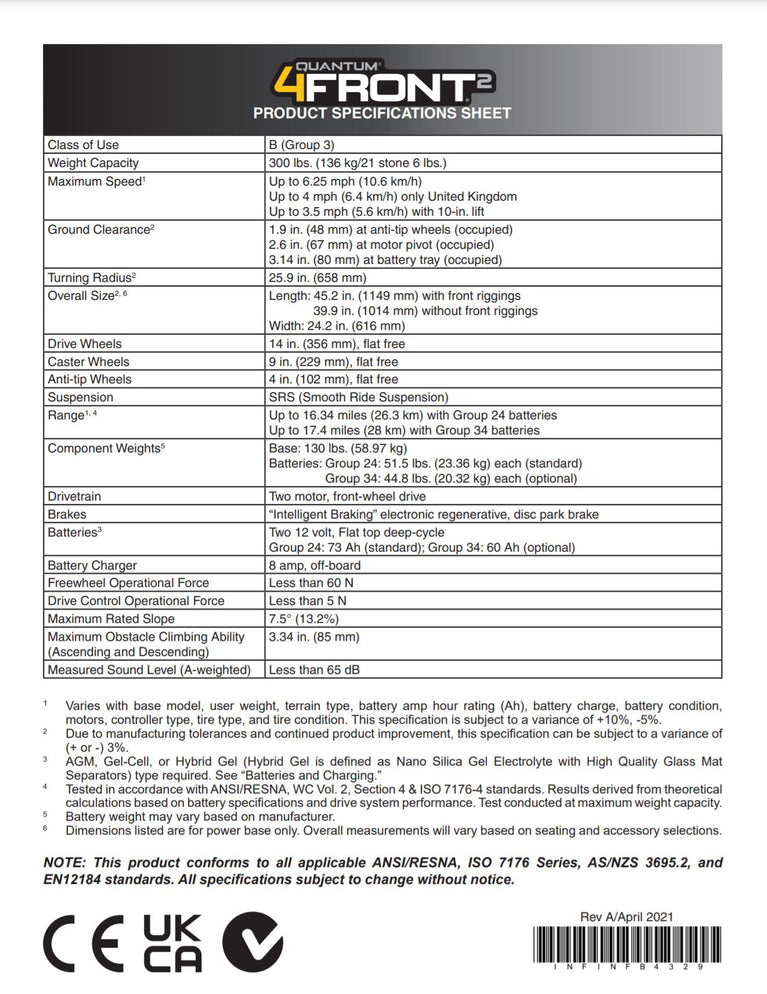 While compact, the 4Front 2’s large 9” rear castors make it perfect option for gravel driveways, as well as for indoor use. Large batteries and motors allow the 4Front 2 to perform in hilly and challenging environments too.