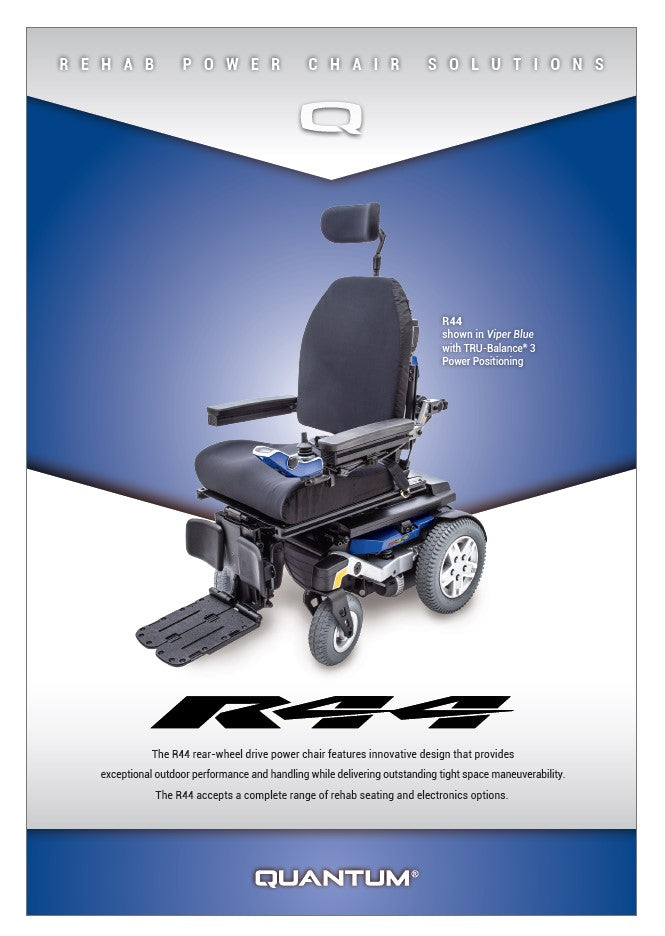 The Quantum R44 rear-wheel drive powerchair features innovative design that provides exceptional outdoor performance and handling while delivering outstanding tight space manoeuvrability. The Quantum R44 accepts a complete range of rehab seating and electronics options, allowing for full customisation of your powerchair.