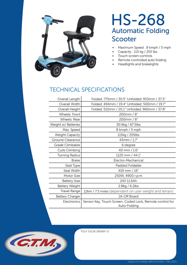 The CTM HS268 is a great travel scooter and can be taken on a plane, cruise ship and public transport. It comes in a sleek sky blue colour, making sure you're looking great out on the streets! Check out the video tab to see how the scooter auto-folds and unfolds.