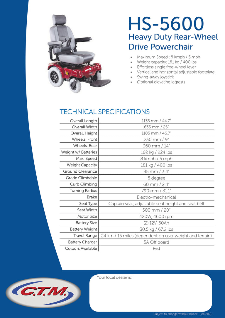 Available for purchase through our partner stockists. View our stockist page to find your local stockist. The CTM HS-5600 rear-wheel drive powerchair is well built with large rear wheels and front castors to provide a stable base that is comfortable on any terrain. Included with the HS-5600 is a captain style seat with head rest, adjustable back angle, adjustable flip up arm rests and a flip up footplate.