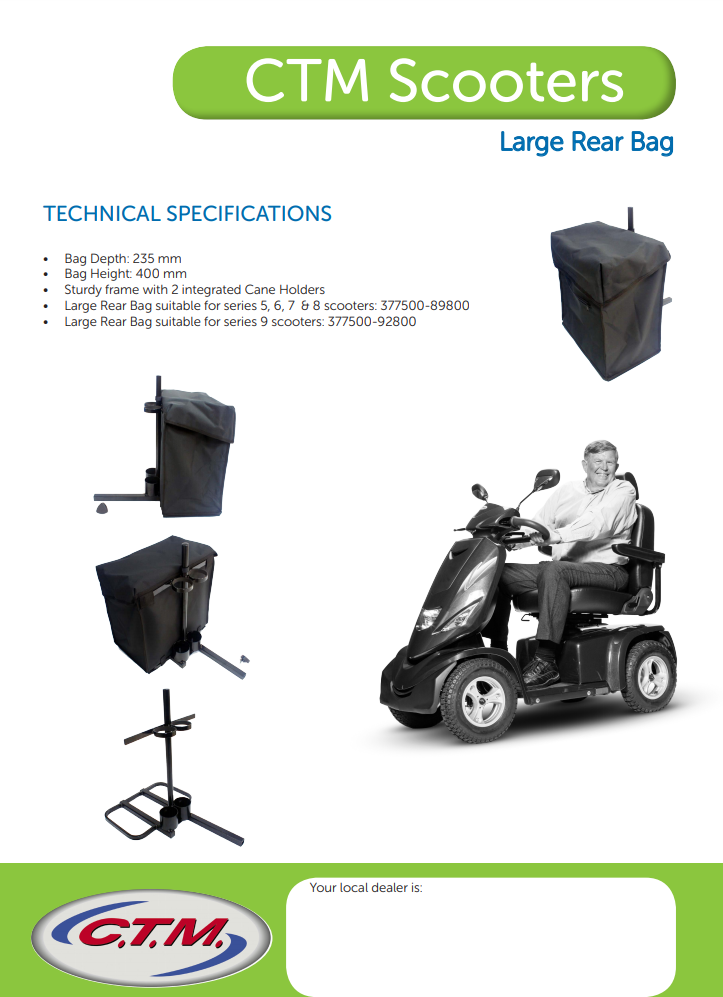 The rear bag is a functional storage bag which attaches to your mobility product. Store your personal items in the bag for when you're out and about.