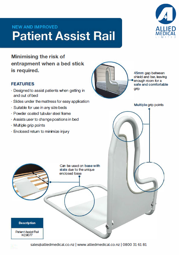 Designed to help people get in and out of bed, and change their sleeping position with ease. This rail plays a role in minimising the risk of people hurting themselves in bed, and features a unique inner shield to protect against entrapment. The multiple grip points on the rail ensure full support when getting in and out of bed.