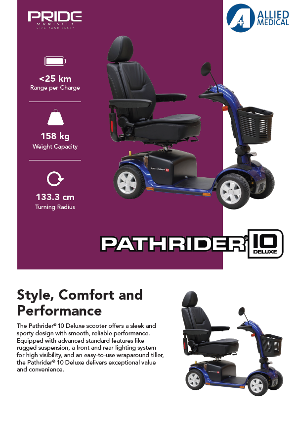 The Pride Pathrider 10 Deluxe is a stylish, mid-size mobility scooter designed to deliver a smooth and reliable ride. With a sporty look and advanced standard features, it offers great performance for everyday use. The feather-touch disassembly makes transporting and storing your scooter simple, while the full suspension and high back seat with headrest ensure a comfortable journey. Practical additions such as a rear-view mirror, LED lighting, and a large front basket provide safety and convenience whether you are heading to the shops or enjoying the outdoors.