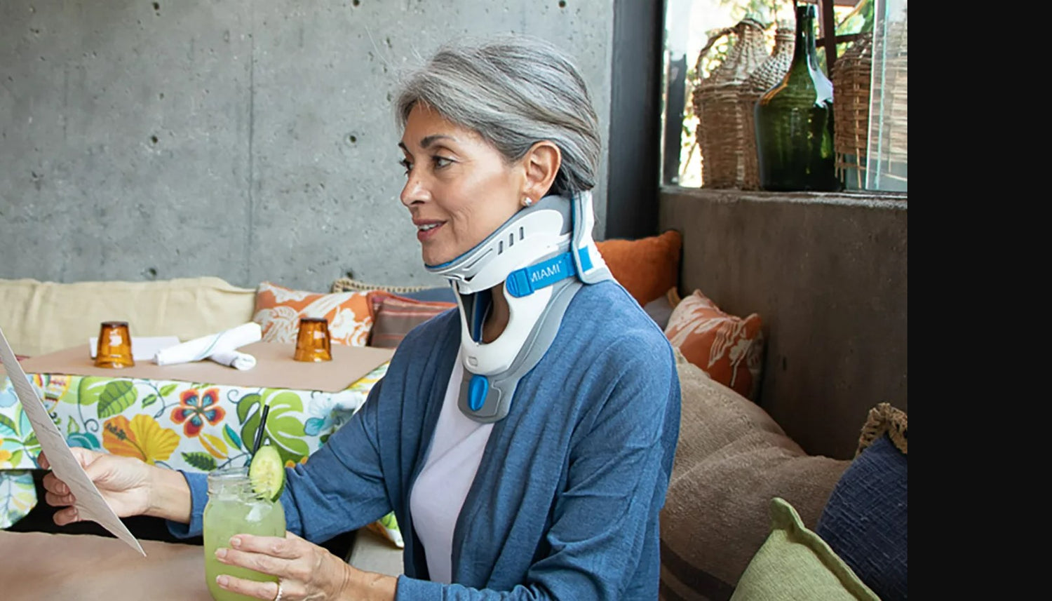 Miami J is bioengineered to minimize key pressure points like the chin or back of the head. It features comfort adjustment angulation buttons to fine tune fit and relieve pressure, and flexible sternal pads that can be removed for eating, excessive swelling, or for sleeping comfort.