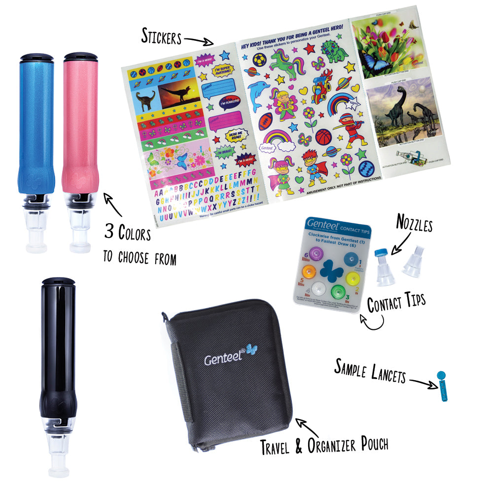 Genteel is the world’s only lancing device that uses vacuum and depth control to draw blood from anywhere on the body without pain. Each Genteel Plus Device comes with 6 contact tips, 2 nozzles, travel and organizer pouch, decals, sticker sheet for kids, and sample Butterfly Touch Lancets.