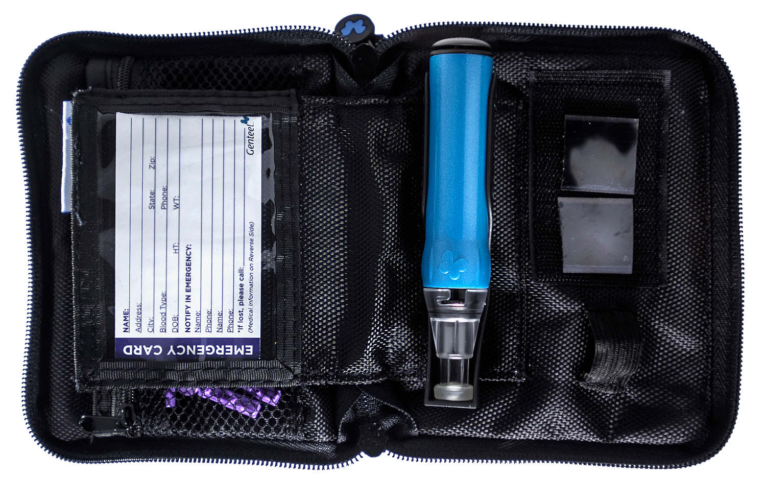A convenient pouch to store your Genteel or Genteel Plus Device, Lancets and Contact Tips when on the go. This durable pouch is compact and includes handy Emergency Card to note down your details and an emergency contact person.