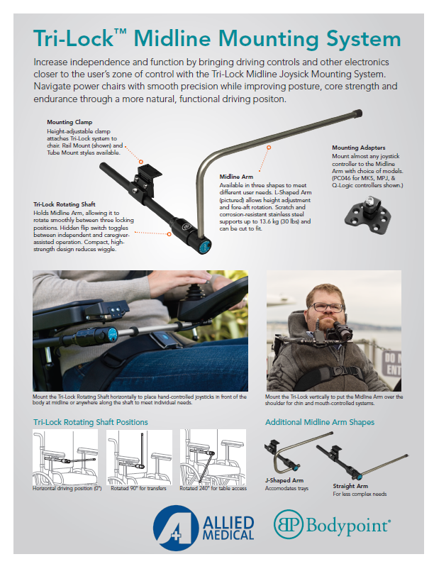 Bodypoint Midline joystick mounting kit contains 1 Tri-Lock rotating shaft, choice of mounting clamp, mounting adapter and midline arm. Durable, precise and customisable joystick mount for powerchairs. Choose Rail or Tube Mount to suit your chair and control preferences.