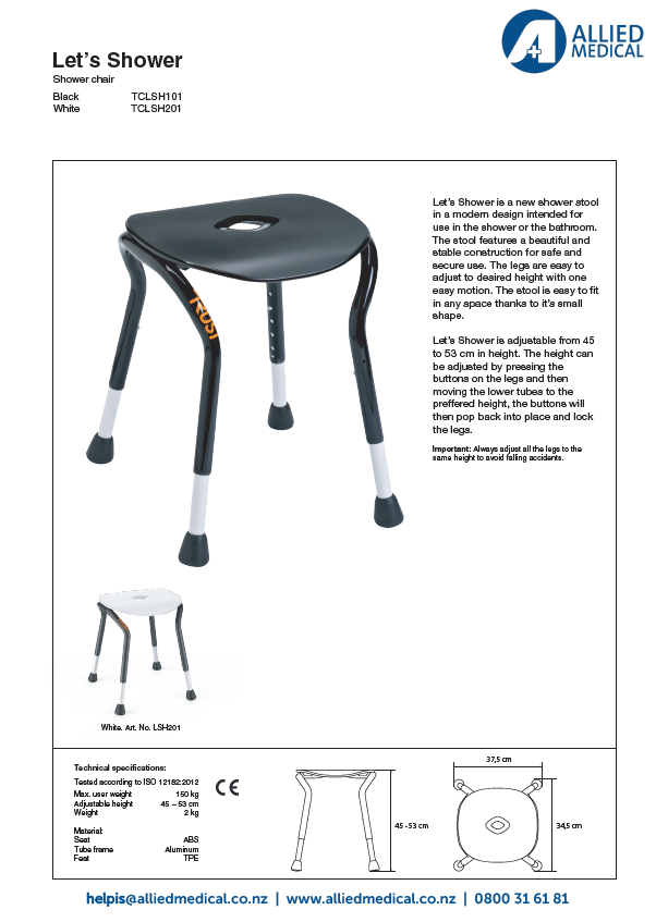 The Let’s Shower Shower Stool is a compact, comfortable seating option for the bathroom. Lightweight, height adjustable, and stable with non-slip feet for safe, everyday use.