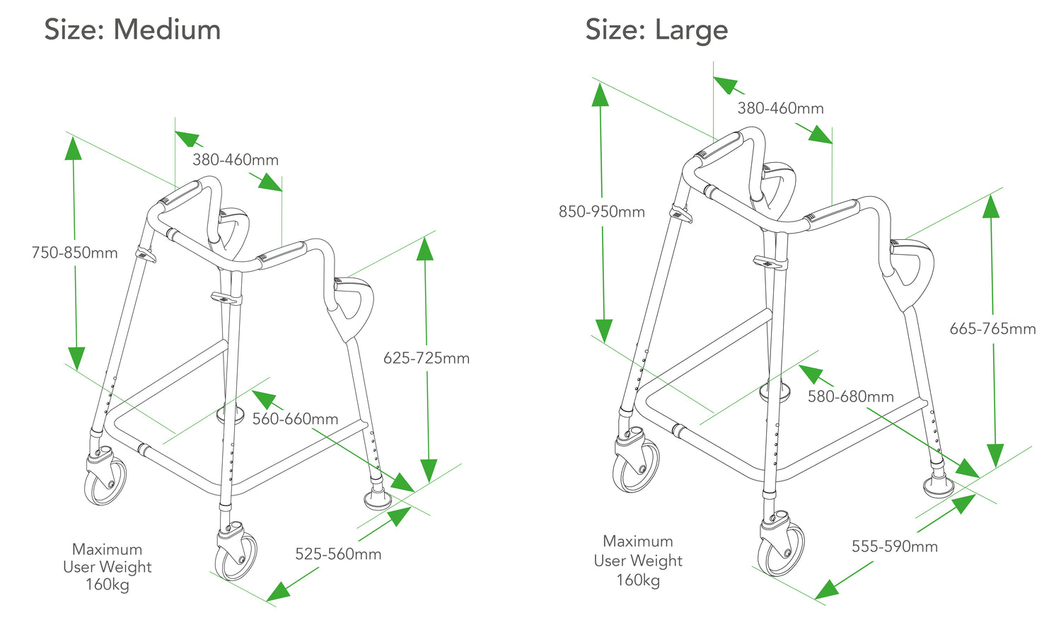 - Swivel 125mm Castors with Magnetic Directional Bias which allows user to turn without lifting the frame, whilst maintaining straight line stability