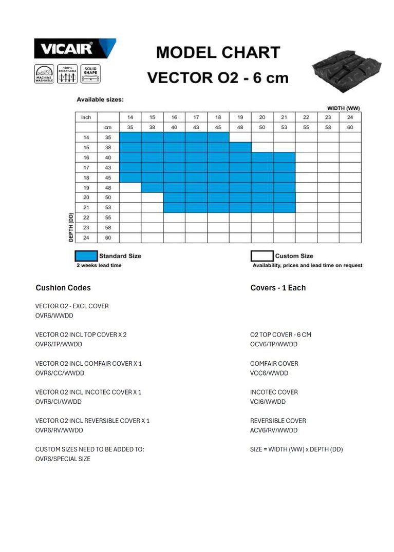 The Vicair Vector O2 is a highly stable, breathable wheelchair cushion designed to offload the ITs and coccyx while supporting pelvic stability and leg positioning. Available in 6 cm and 10 cm heights and multiple sizes, it includes a Vicair Comfair Cover and is fully machine washable for everyday hygiene.