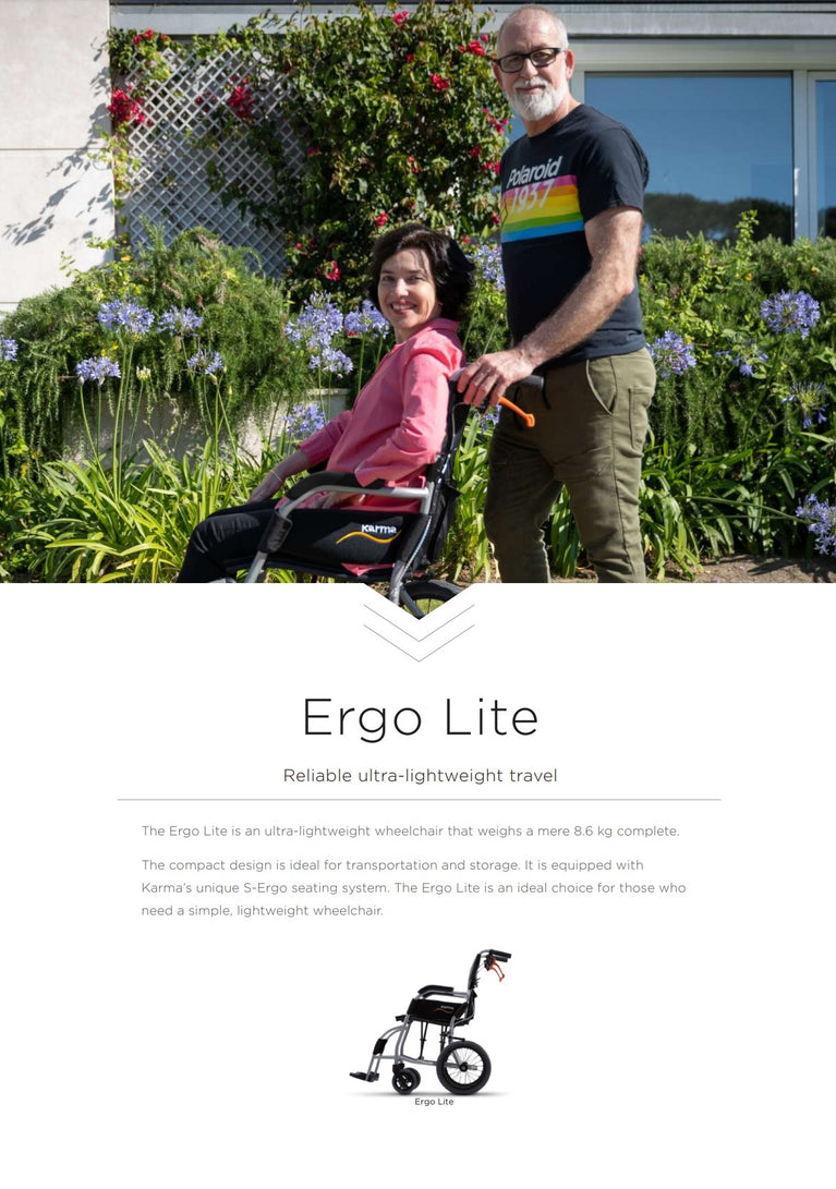 The Karma Ergo Lite Transit Wheelchair is a top selling, ultra-light wheelchair. It folds down to take up virtually no space in the boot of a car and weighs only 8.5 kg – making it easy for anyone to lift into a vehicle. The Karma Ergolite is the perfect chair if you're seeking a solution for outings to the park, shopping mall, or anywhere in the community for that matter.