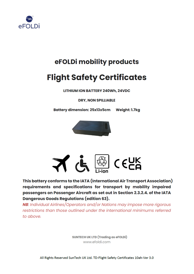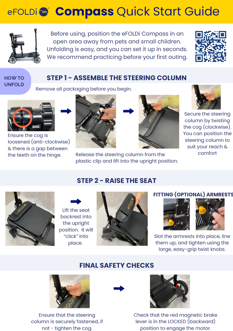 The eFOLDI Compass is our first 4 wheel bi folding mobility scooter and is designed to make travel simple, safe and enjoyable. It is lightweight at only 11 kg excluding the battery, and offers an impressively tight turning circle for a 4 wheel scooter which makes everyday manoeuvring easier. Secure Turn technology helps improve stability and control by detecting movement and orientation changes, then adjusting automatically to keep the ride smooth on uneven or sloped surfaces.