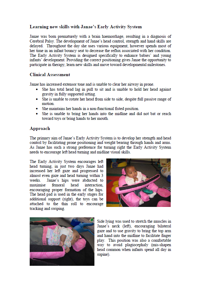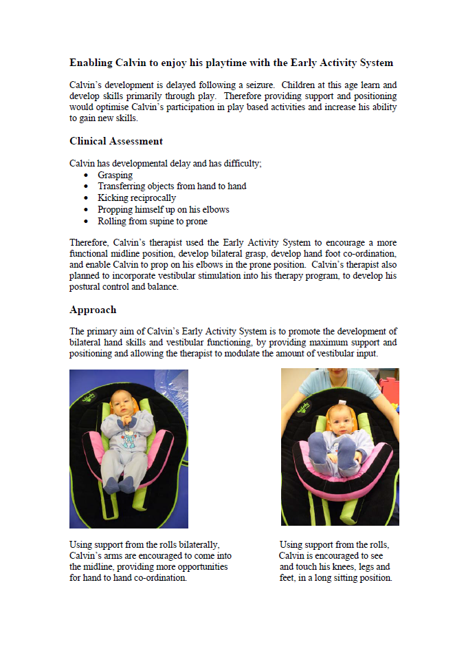 The system supports the child in a secure and comfortable position, allowing them to engage in a much broader range of activities than they might other wise do. The EAS has been designed to be used by parents and therapists, allowing babies with special needs the opportunity to learn and develop throughout this vital stage of their lives.
