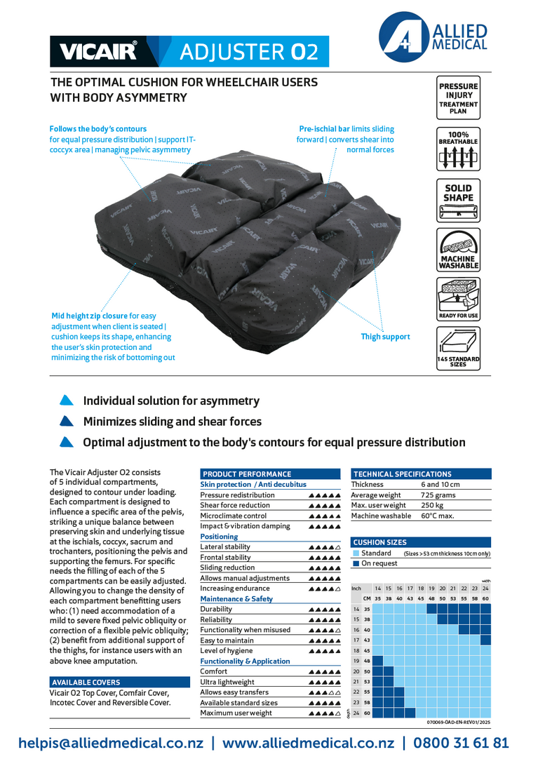 The Vicair Adjuster O2 is designed for wheelchair users with asymmetric body contours or amputations, offering a high level of comfort, stability and skin protection. It is available in three height options, 6 cm, 10 cm and 12 cm, allowing clinicians and users to select the level of immersion and support required. The cushion automatically manages small obliquities and can be individually adjusted to support more extreme asymmetry. Its design promotes total immersion for equal pressure distribution and includes a pre ischial section to help minimise forward sliding and shear forces. Filled with air filled SmartCells, the Adjuster O2 supports users at low to very high pressure injury risk and is fully breathable for effective temperature and moisture regulation. It is supplied with a Vicair Comfair Cover and is fully machine washable at 60°C with the SmartCells in place. Available in various widths and depths, it can be matched to a wide range of seating needs.