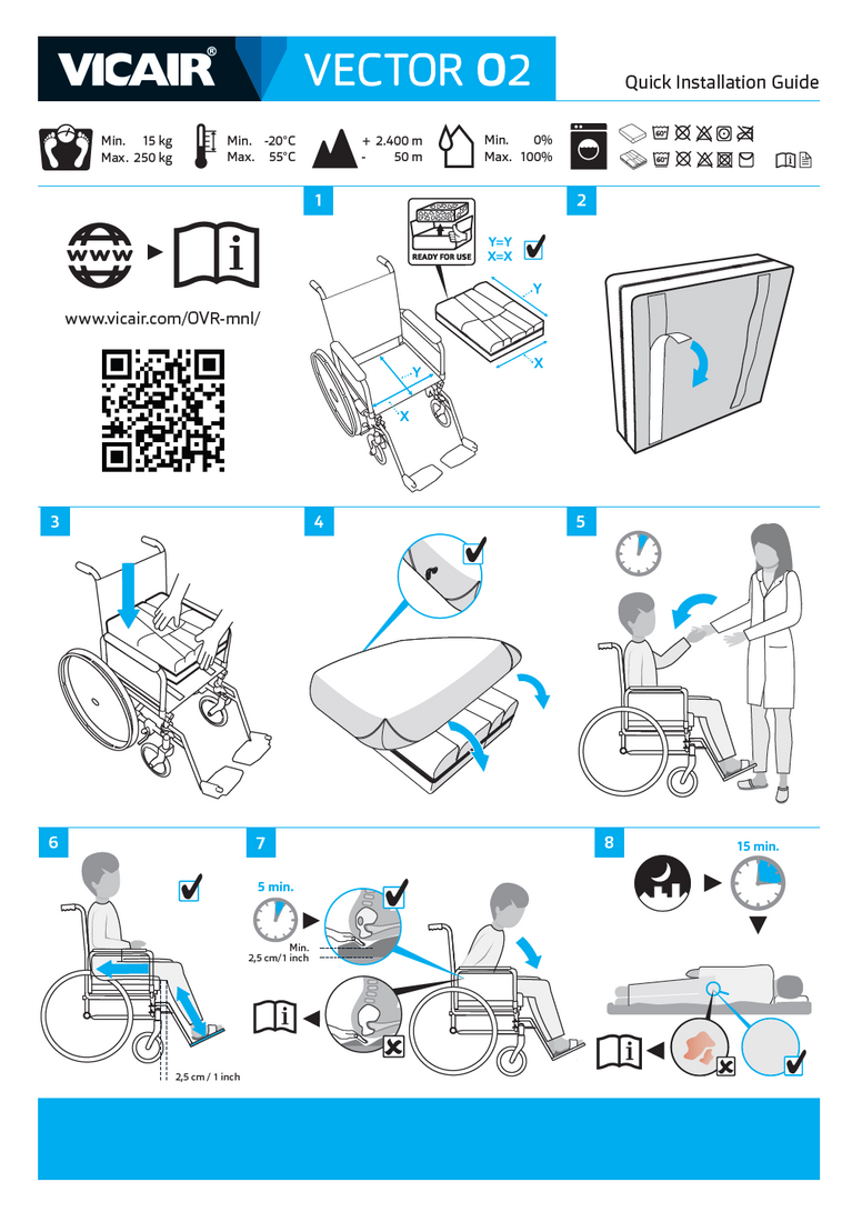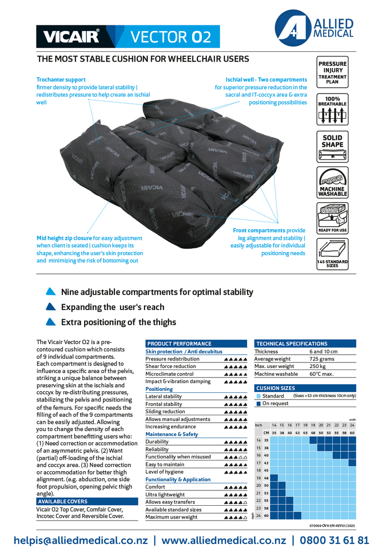 The Vicair Vector O2 offers excellent stability, skin protection and comfort for wheelchair users at low to very high risk of pressure injury. Available in two height options, 6 cm and 10 cm, it features a unique nine compartment layout that helps offload the ITs and coccyx while enhancing pelvic stability, thigh positioning and leg guidance. Filled with air filled SmartCells for optimal pressure redistribution, it supports improved upper body function and expanded reach. The cushion is 100 percent breathable for effective temperature and moisture regulation, ultra light at around 725 g (average) and fully machine washable at 60°C with the SmartCells in place. Supplied with a Vicair Comfair Cover and available in multiple widths and depths, it can be matched to a wide range of seating needs.