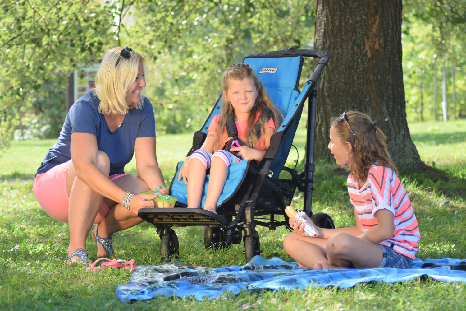 The buggy is equipped with a seat base that has an adjustable calf rest, extended reclining backrest, solid wheels, detachable and adjustable footrest and a 5-point harness with crotch belt and shoulder padding. The variability of this buggy and the ability to attach a wide range of accessories allows the user's varying needs to be safely catered for.